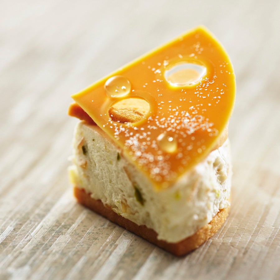 パルメザンチーズクッキーで挟んだ軽やかタッチのムース。焼チーズ独特の香りにふんわりとはちみつが重なります。