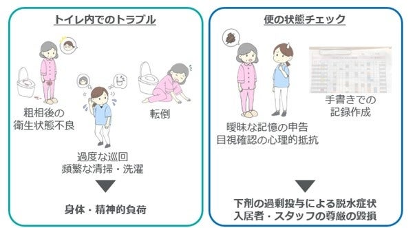 高齢者施設においてトイレ利用時における状況の把握および排便状況の確認は、衛生的で健康的な生活を維持するうえで重要な項目です。しかしながらトイレ内での転倒や排泄時の粗相による衛生状態不良を防ぐためにスタッフによる過度な巡回に加えて頻繁な清掃・洗濯が必要となるなど、身体・精神的負荷が高い状況です。また排便状況の確認は、入居者のあいまいな記憶による申告のため適切な下剤の投薬判断が困難となっている他、目視確認の心理的抵抗や、記録作成はスタッフの手書きのために負荷が高いなど、高齢者施設において解決困難な課題があるのが現状です。