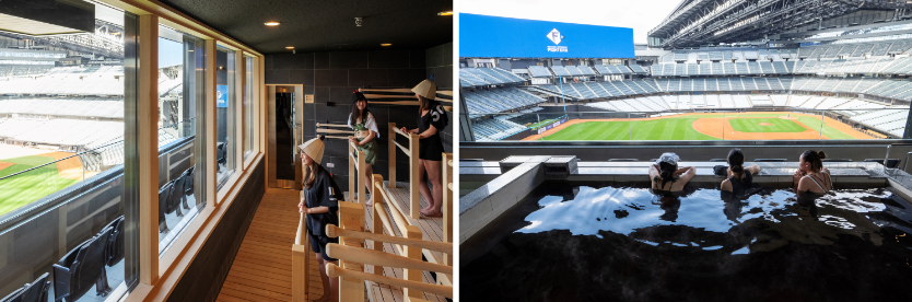 試合のある日のみならず試合のない日も営業しており、カップル、団体など男女が一緒に体験できる水着着用ゾーンのサウナや浴槽、フィールドを見下ろす24席の“ととのえテラスシート”を用意。随所に散りばめられたベースボールインテリアも大変ご好評をいただいております。また、屋内バーゾーンには球場内醸造のオリジナルクラフトビール、各種ドリンクや軽飲食を楽しめる空間を完備しています。一般利用に加えて野球の試合生観戦、法人・団体の貸切イベント利用、ランナーが周辺のランニングコースを走った後にサウナに入ってととのう「ラン&サウナ」イベントや、親子で楽しめるキッズタイム利用などエンターテイメント性あふれる多様な体験ができる温浴施設です。