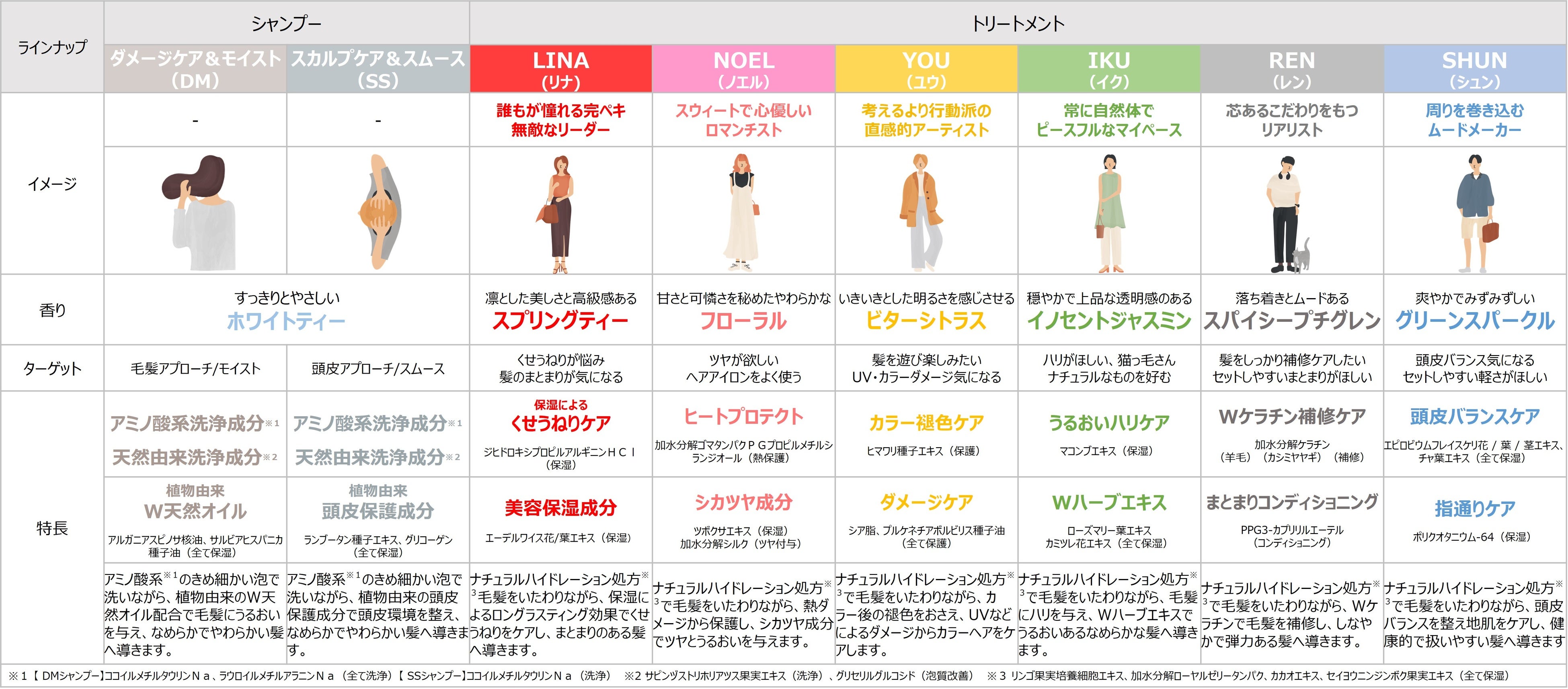髪質や質感といった機能性だけではなく、「好き」という直感でアイテムを選べるように6種のトリートメントを一人の人間に見立て、キャラクター化しているのが特長です。