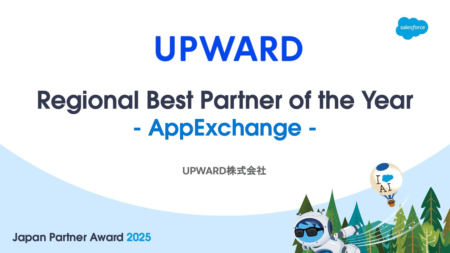 UPWARDは、Salesforce Japan Partner Award 2025における「Regional Best Partner of the Year - AppExchange -」を受賞しました。昨年度の首都圏を除く地域におけるAppExchangeでのビジネス規模およびビジネス成長率が総合的に評価され、特に秀でた実績を残したとして当アワードに選ばれました。