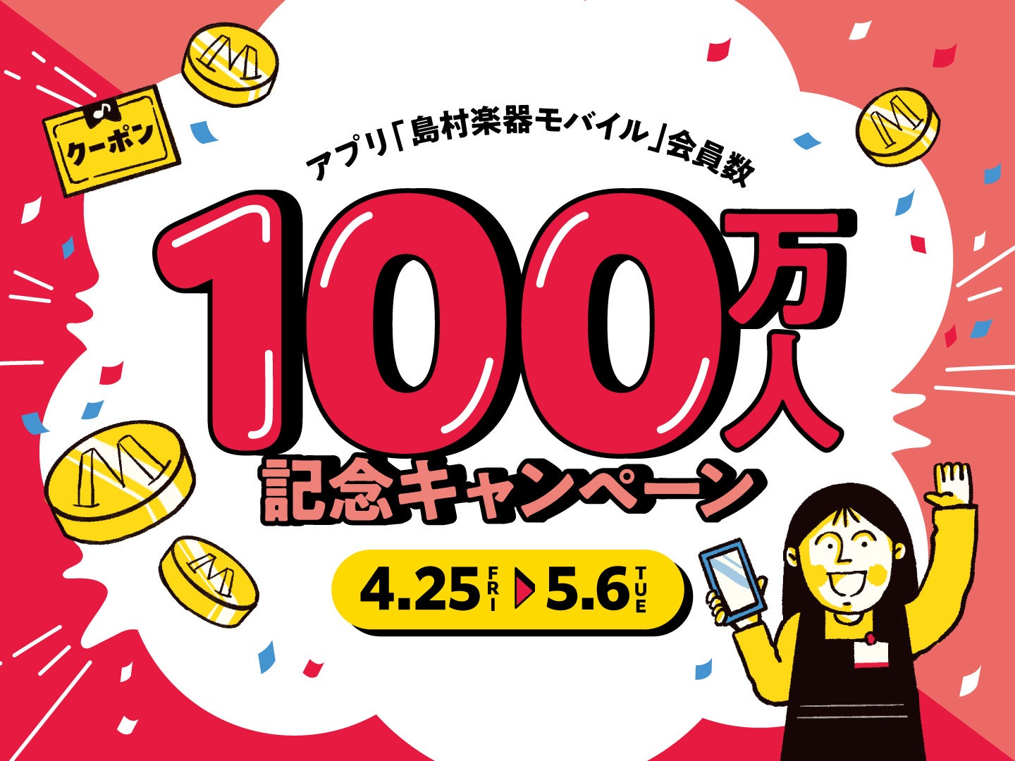 島村楽器株式会社(本社:東京都江戸川区、代表取締役社長:廣瀬 利明、以下 島村楽器)は、島村楽器公式アプリ「島村楽器モバイル」の会員登録数が100万人を突破(※)したことを記念し、日頃のご愛顧に感謝を込めて「島村楽器モバイル 会員100万人記念キャンペーン」を2025年4月25日(金)~5月6日(火・祝)まで開催いたします。