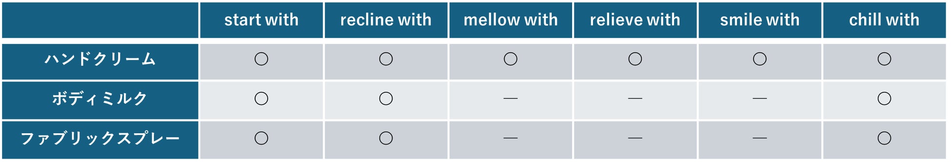 私たち自身の香り(匂い)に近い香気成分を配合しています。(※relieve withを除く)