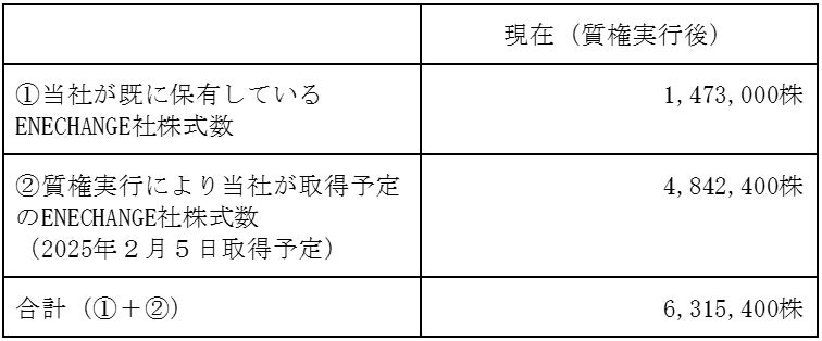 城口氏への貸付け金については返済期日が既に到来しておりますが、本日時点で返済がなされていない状況であり、城口氏は当社からの貸付けに係る期限の利益を喪失したこととなります。従って、当社は株式質権設定契約に基づき質権設定全株式に対して当該質権を実行し、城口氏保有のENECHANGE社株式4,842,400株(発行済み株式総数に対する比率※11.41%)を2025年2月5日に取得予定となり、既に保有している1,473,000株と合算すると発行済み株式総数に対する比率※14.88%(議決権割合で14.94%)となる予定です。