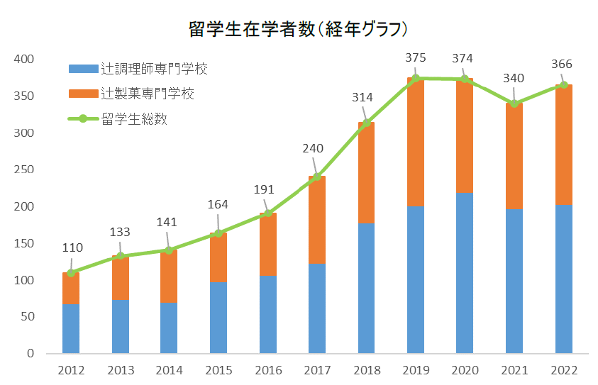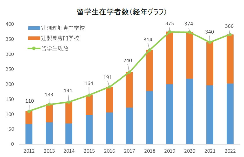 辻󠄀調理師専門学校、辻󠄀製菓専門学校(大阪市、校長:辻󠄀芳樹)には、2022年度新入学留学生が209名、進級した在校生と合わせて合計366名の留学生が在学しています。近年の新型コロナウイルス流行により、全学生の約2割を占める本校の留学生も少なからず影響を受けており、入学の延期や休学を余儀なくされていましたが、少しずつ状況が戻りつつあります。(下図参照※)