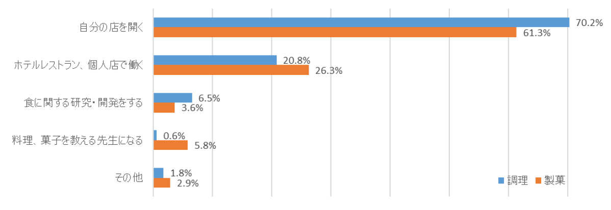 将来の展望としては、いろいろなところで修業した上でと前置きしつつ、「自分の店を開く」と答えた留学生が、料理に70.2%、菓子に61.3%いました。また目指す料理人・パティシエのイメージは、「今の自分に満足せず、いつでも自分と業界の発展のために頑張る人」「大切な人々を笑顔や幸福にでき、安全で美味しいパンを届ける職人」「ミシュラン3ッ星のシェフになってたくさんの後輩を育てていきたい、そしてたくさんの雇用を作りたい」「自分が決めた1つの料理を研究してその料理の分野で頂点に立つ」「誇りをもって働ける人」などがあげられました。