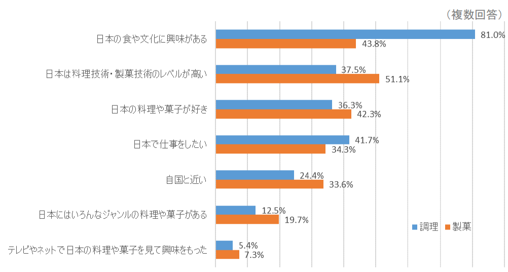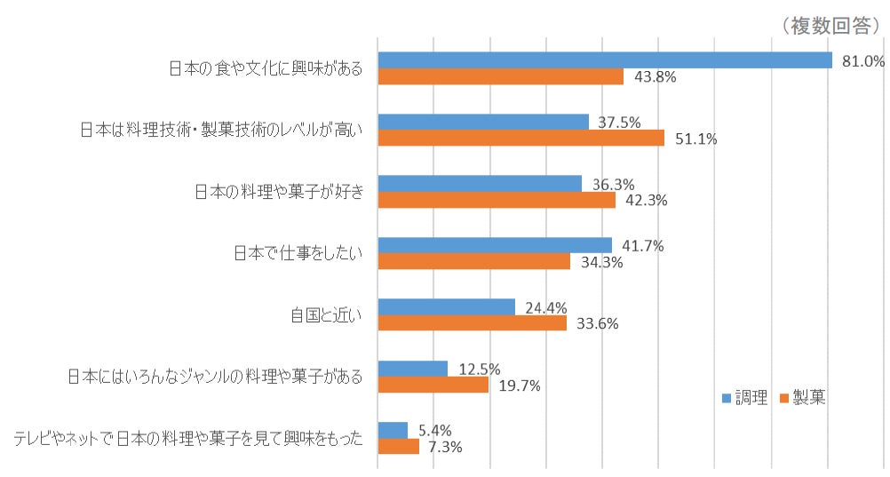それぞれのジャンルを選択した理由として、日本料理は「1品ずつ道理があって美味しいし、見た目も調理法も深く心惹かれた」のほかに、「調理法や食材の扱い方が世界の飲食業界に大きな影響を与えている」「日本料理は世界で人気だから」「自国にも日本料理店がたくさんある」というコメントが多く、日本料理そのものに魅力を感じつつ、世界のトレンドを意識して学ぶジャンルを選択している学生も多いようです。また、洋菓子では「日本にしかない洋菓子を学びたい」や、西洋料理でも「日本と西洋が調和した料理を学びたい」などの意見が多くあり、日本版世界の料理・菓子に高い関心があることがうかがえました。人気が高まっている製パンについては「自国では西洋文化の影響で主食が米からパンに変わったから」「日本では様々な国の多種類のパンが学べると聞いた」「自国の製パン技術はまだ未熟だから日本で学びたい」などを理由にあげており、日本での学びを自国で活かそうと考える学生が多いようです。