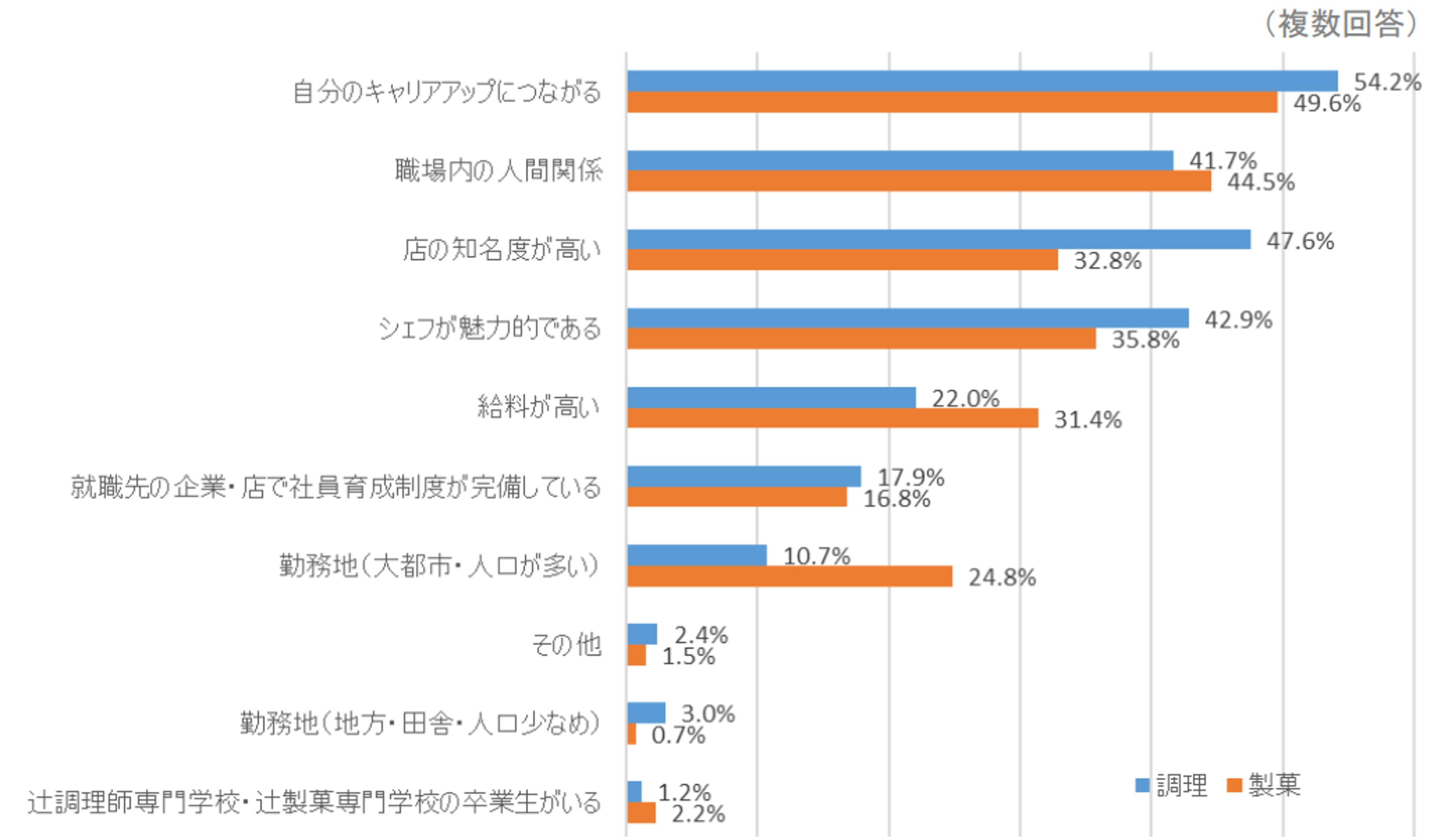 また就職先を選ぶ基準として、「自分のキャリアアップにつながる」が最も重視され、次いで「職場の人間関係」「店の知名度が高い」「シェフが魅力的である」という結果でした。「その他」の意見としては、「海外転勤の機会がある会社がいい」「他文化を受け入れる現場であってほしい」「店の料理がおいしい」などがあげられていました。