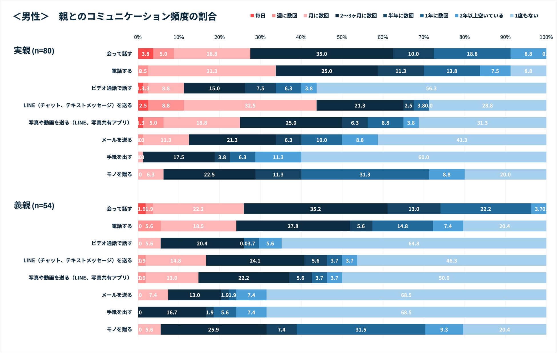 二人暮らしをする親が最も多く3割の親は一人暮らしで、「片道30分以内」で親に会える人は2割前後。物理的に遠い距離で親と暮らしている。