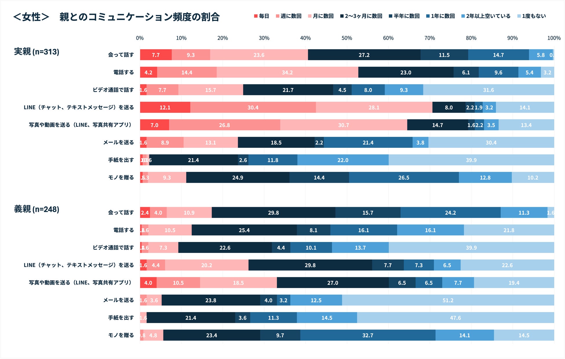 親とのコミュニケーション頻度:女性の場合は約7割が実親と、約3割が義親と毎月コミュニケーションをとっている。