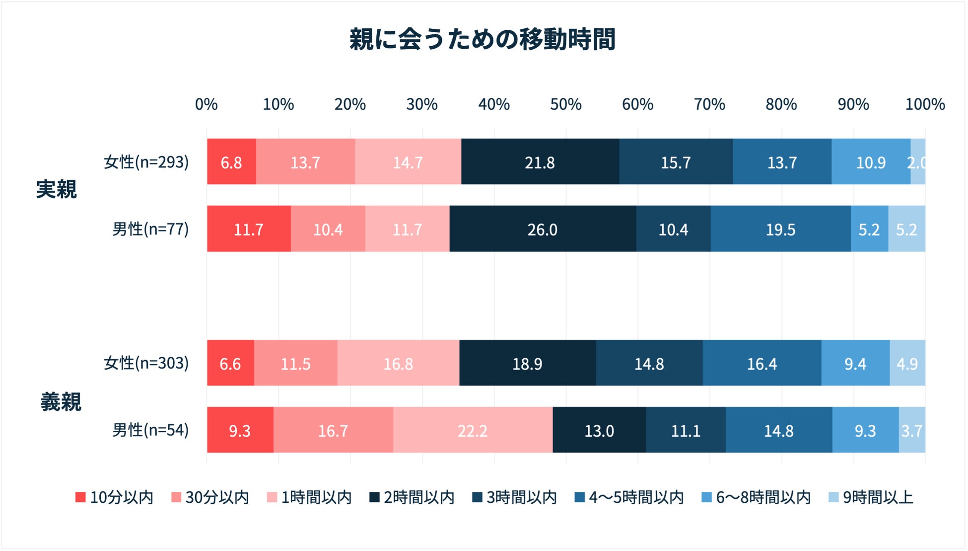 会いに行く移動時間:「片道30分以内」で親に会える人は2割前後。物理的に遠い距離で親と暮らしている。