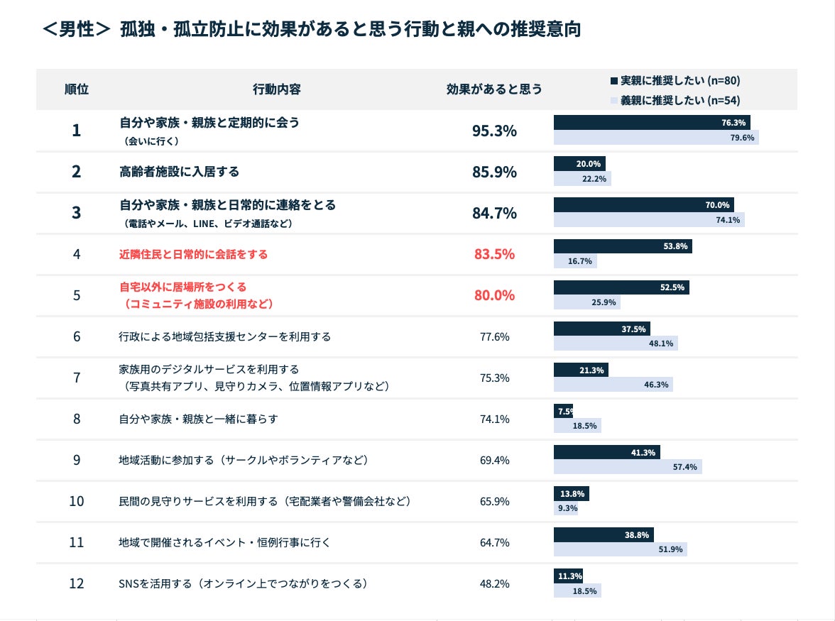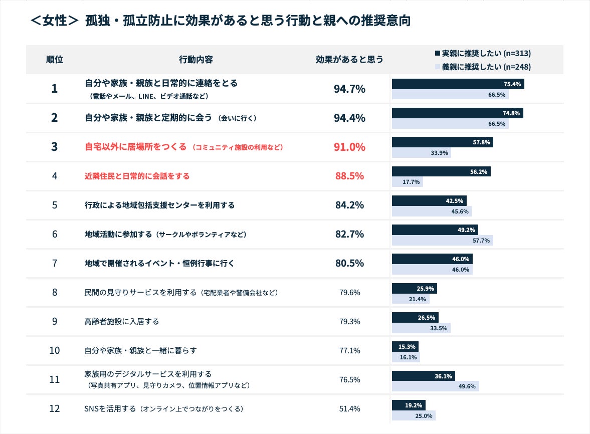 女性の約9割、男性の8割以上が親の孤独・孤立防止に「自宅以外の居場所をつくる」「近隣住民との日常会話」は効果があると回答し、「一緒に暮らす」ことよりもその割合が高い。