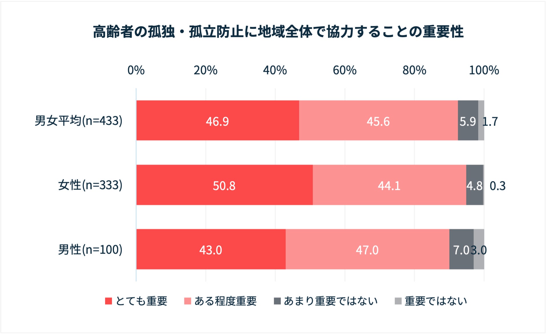9割以上の人が地域全体で高齢者の孤独・孤立防止に協力することが「重要」と回答。