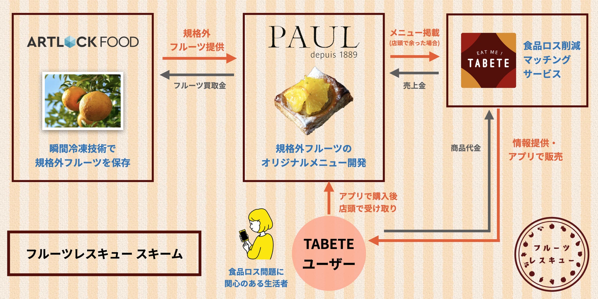「食べるだけで食品ロス削減になる」オリジナルメニューを月替りで開発・販売する企画。フードロス削減サービス「TABETE」の声がけにより、ブーランジェリー「PAUL」・特殊冷凍フルーツ「アートロックフルーツ」との三者協力企画として「フルーツレスキュープロジェクト」を2020年10月の世界食糧デーより期間限定で実施して参りました。この度、食品ロス削減効果がみられたことや、実際のお客様からのご好評をいただき、本企画を通年で実施することが決定いたしました。本企画は、1年を通して廃棄の危機にある果物を美味しく食べていただくとともに、生活者の皆様に「食品ロス」の課題を身近に感じてもらう事ができる企画です。