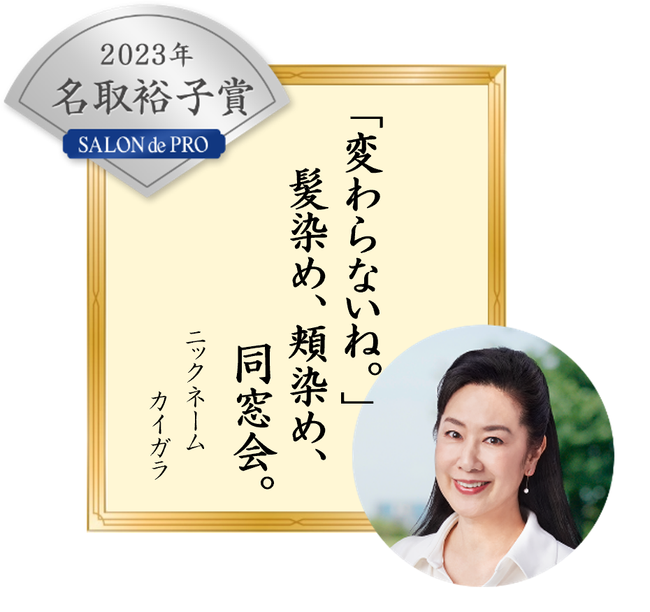 「サロン ド プロ 白髪川柳」はニオイのない白髪染め「サロン ド プロ」が2012年秋から実施している川柳コンテスト。毎月1回その月の優秀作品5句を選定し、サロン ド プロ ブランドサイトで発表しています。そしてこのたび、2023年1月~12月の優秀作品としてノミネートされた60句の中から、2023年の年間グランプリを一句選定いたしました。さらに今年度はサロン ド プロのCMに出演しているタレント2名の選出による、「名取裕子賞」「濱田マリ賞」、さらには「審査委員長賞」も同時に設け、合計4句が選ばれました。