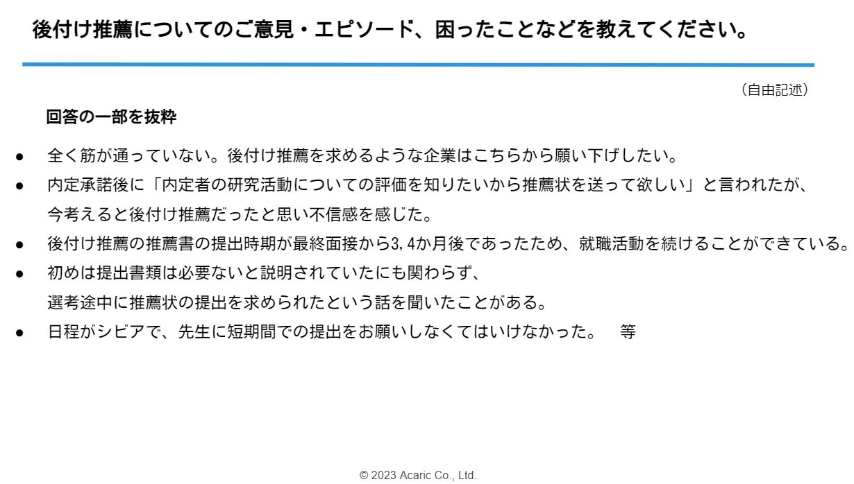 また、後付け推薦に関する意見を尋ねたところ、否定的な意見が多く寄せられました。
