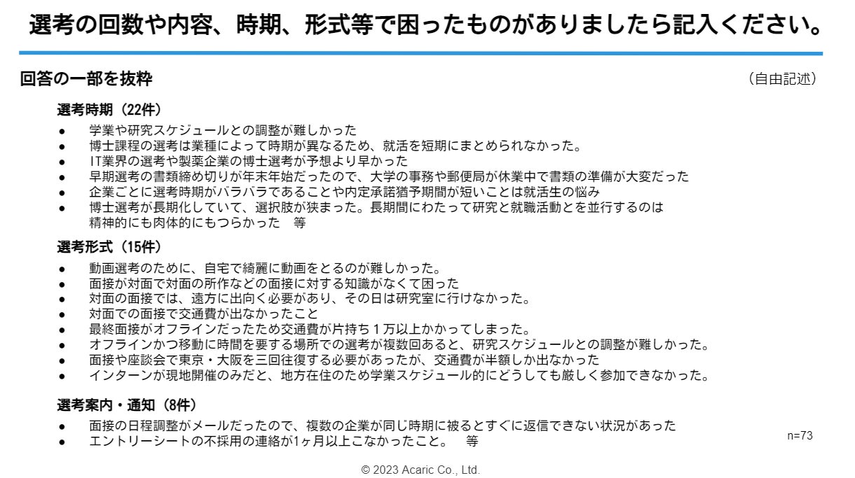 選考を受ける上で困ったものについて尋ねたところ、「学業や研究スケジュールとの調整が難しかった」等といった選考時期に対する不満や、対面形式の選考に参加する際の移動時間・交通費の自己負担に対する不満が寄せられた。多くの時間を自身の研究活動に費やす理系学生からは、選考の日程に自由度を持たせる配慮や、研究活動を両立しやすい選考形式を提供することが求められています。