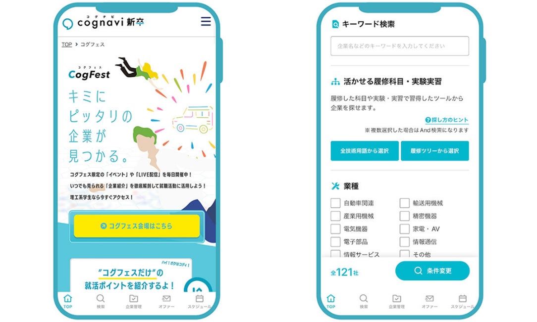 スマートフォンアプリ「コグナビ新卒」では、理工系学生の「学び」と企業が求める「スキル要件」をAIマッチングでつなげる機能や、ユーザーに寄り添ったUIデザインの開発に協力しました。
