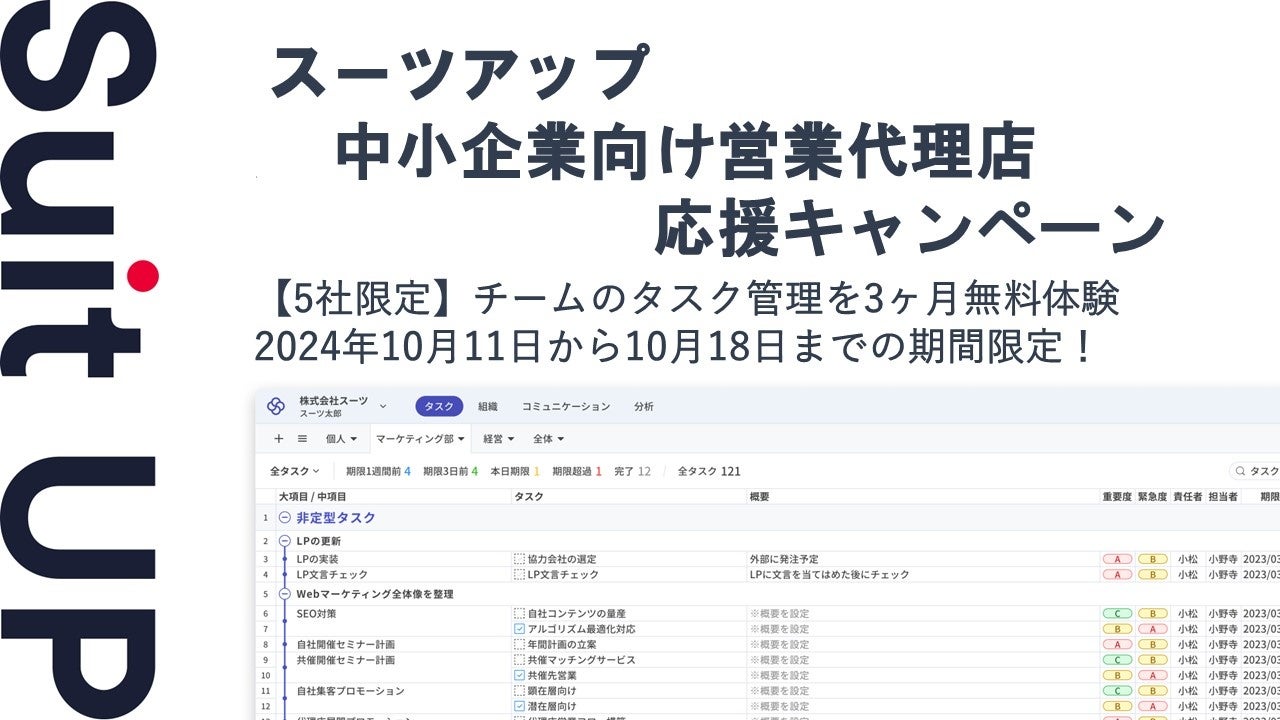 株式会社スーツ(所在地:東京都千代田区、代表取締役社長CEO:小松 裕介)は、チームでかんたん、毎日続けられるプロジェクト・タスク管理ツールの経営支援クラウド「Suit UP」(スーツアップ)において、中小企業向け営業代理店応援キャンペーンを実施いたします。