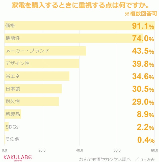 では、実際に家電を購入する際、どんな点を重視するのでしょうか。複数回答可で聞いてみたところ、圧倒的に票を集めたのは「価格」で91%に上りました。次いで、「機能性」74%、「メーカー・ブランド」44%、「デザイン性」40%、「省エネ」35%と続きます。