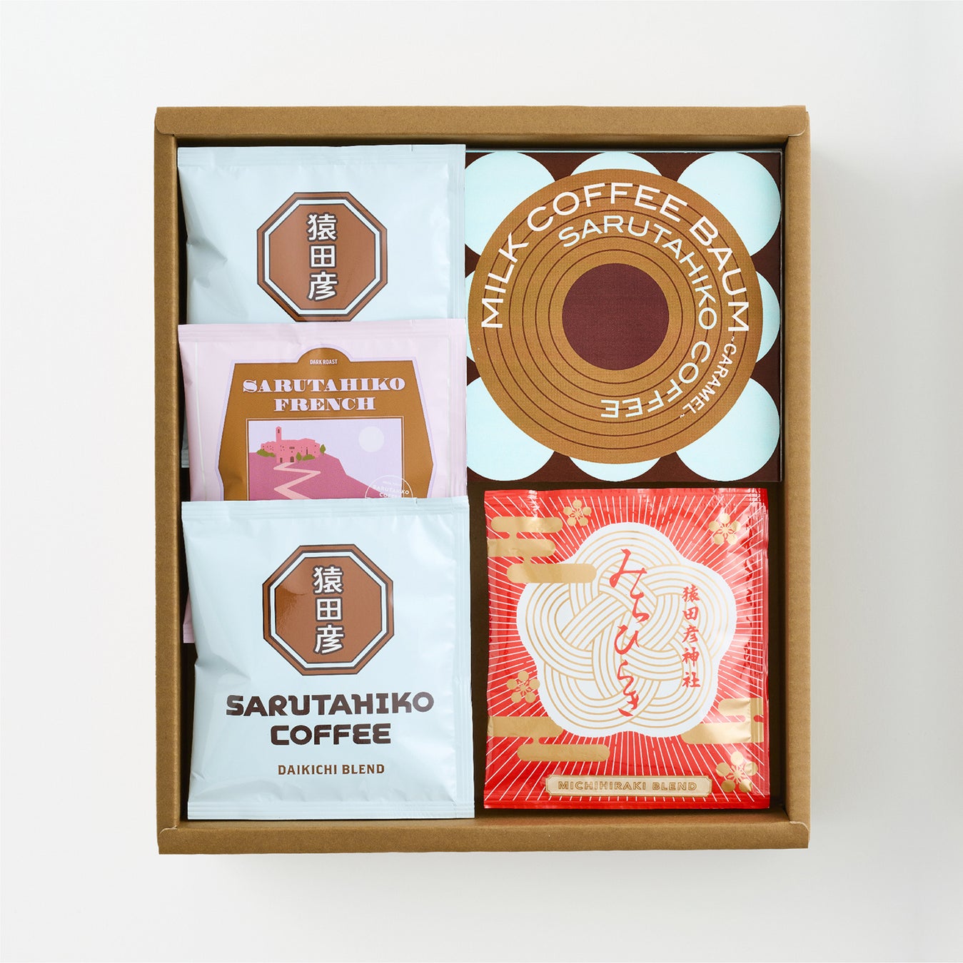 猿田彦珈琲の定番のドリップバッグのセットや、お菓子とカフェオレのもととのセットなど