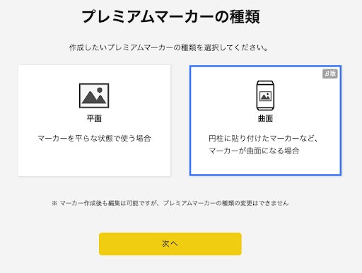 2. 「プレミアムマーカーの種類」にて「曲面」を選択