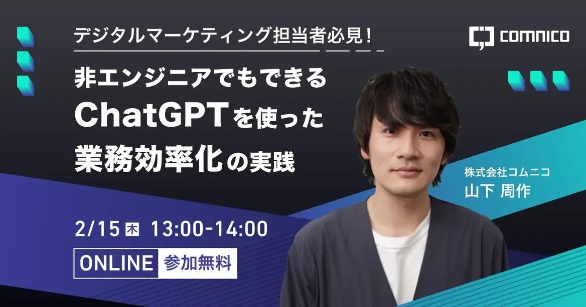 株式会社ラバブルマーケティンググループ(本社:東京都港区、代表取締役社長:林雅之)の子会社で、企業のSNSマーケティング支援事業を行う株式会社コムニコ(本社:東京都港区、代表取締役:長谷川 直紀、以下 コムニコ)は、2月15日(木)13時から、無料オンラインセミナー「デジタルマーケティング担当者必見!非エンジニアでもできるChatGPTを使った業務効率化の実践」を開催いたします。