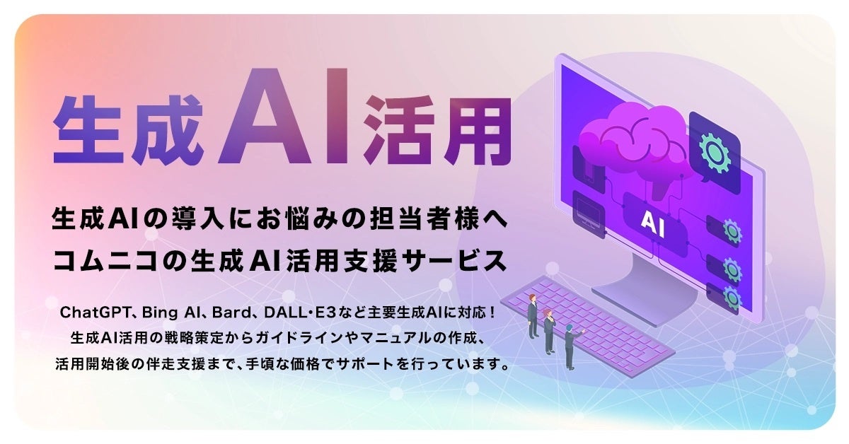 コムニコでは今後さらに生成AI活用支援を活性化させるために、生成AI活用支援サービス専用のサイトを開設いたしました。AI活用の戦略策定、ガイドラインやマニュアルの作成、活用開始後の実行支援などコムニコで可能なご支援内容や、サービスの価格などについて掲載しております。ぜひご覧ください。