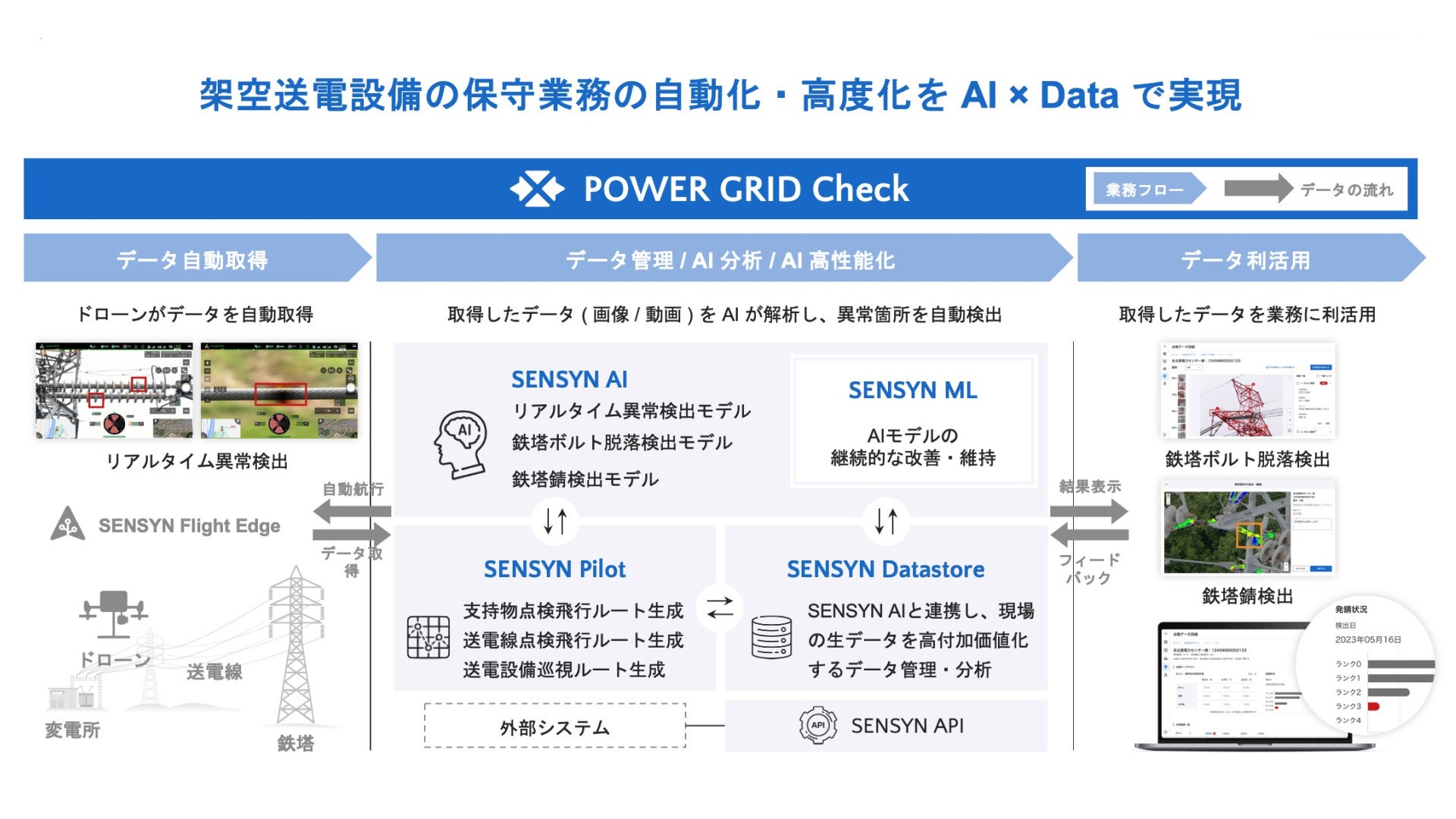 本業務提携により、両社は『POWER GRID Check』の点検対象設備の拡大および先進技術を用いた送配電設備全体の自律的かつ一貫した点検業務の実現を図るとともに、点検業務以外の領域においても、ドローン等のデバイスやAIを活用した技術開発に取り組みます。将来的には、『POWER GRID Check』や新たに開発した技術から得られるデータの高度な分析・利活用を図り、点検業務にとどまらず、送配電業務の全体最適化を目指します。