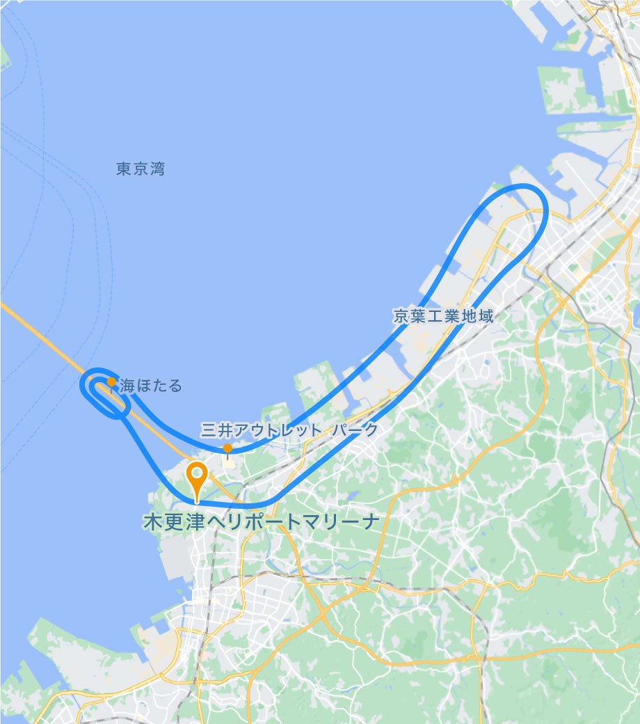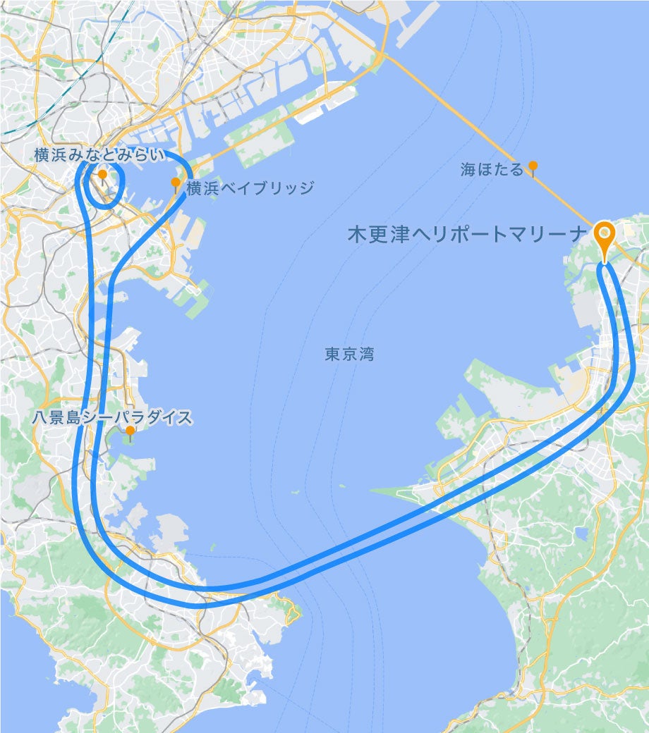 | 木更津・海ほたるコース | 20分 | ¥59,800 | 木更津市街、袖ヶ浦、江川海岸、京葉工業地域、海ほたる |