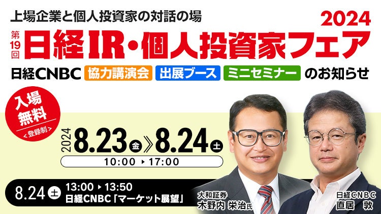 株式会社日経CNBC(本社:東京都千代田区、代表取締役社長:竹之内源市、以下「日経CNBC」)は2024年8月23日(金)、24日(土)に行われる「第19回 日経IR・個人投資家フェア2024」内の日経CNBCブースで、ミニセミナーや「日経CNBC online」会員限定動画の特別放映、来場者限定のプレゼント企画を実施します。