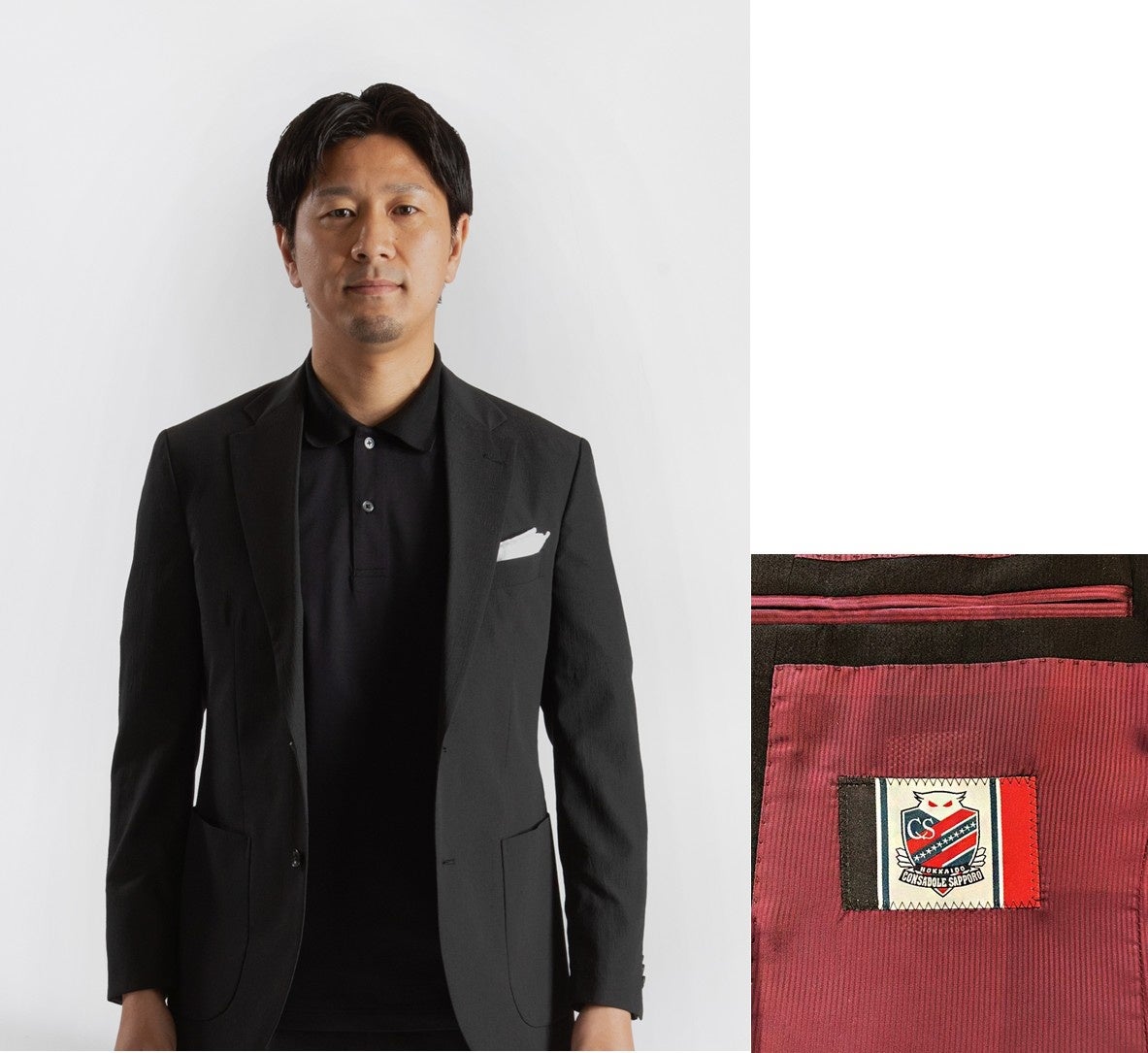 伝統的な美しさと「洗える」利便性を両立した、オーダースーツ「COMFORT(コンフォート)」モデルを採用。気品あるシルエットを保ちつつ、オンからオフまでの幅広いシーンに相応しいスタイルを提案します。素材には、高機能素材「Breeze Cool(ブリーズクール)」を使用しています。優れた通気性と軽やかな質感に加え、ストレッチ性や防シワ性も備えており、猛暑のシーズンもストレスフリーで快適に過ごせます。カラーはブラックを基調とし、無地ながらもシボ感のある生地をセレクトすることで、表情豊かな風合いに仕上げました。また、裏地にはレッドを配し、チームらしい力強さを表現。チームフラッグを刺繍した織ネームやオリジナル刻印釦など、細部にまで情熱を宿した特別な一着です。