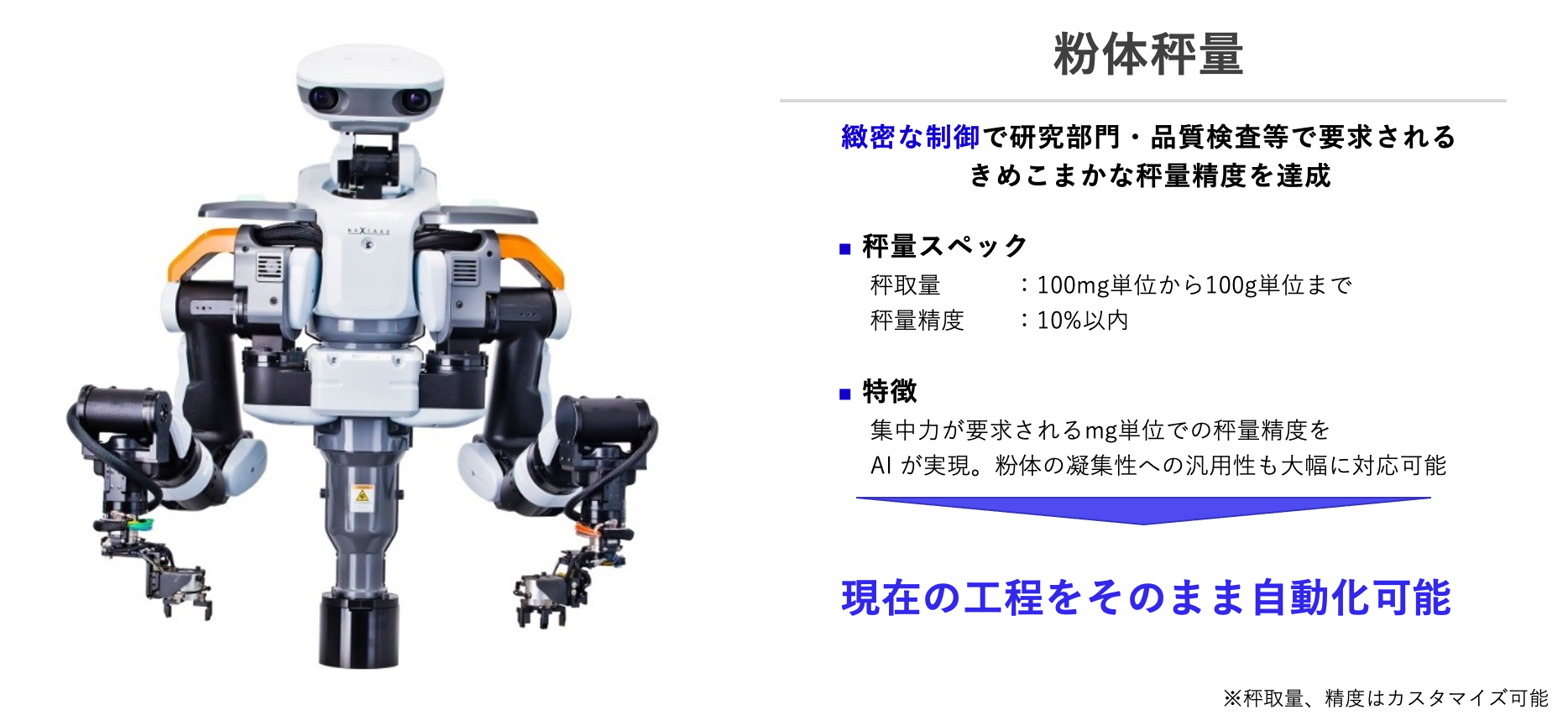 エクサウィザーズ、ヒト型双腕ロボットにより製造業の粉体秤量工程を高速自動化する「exaBase ロボティクス 粉体秤量 for NEXTAGE」をカワダロボティクスと共同開発