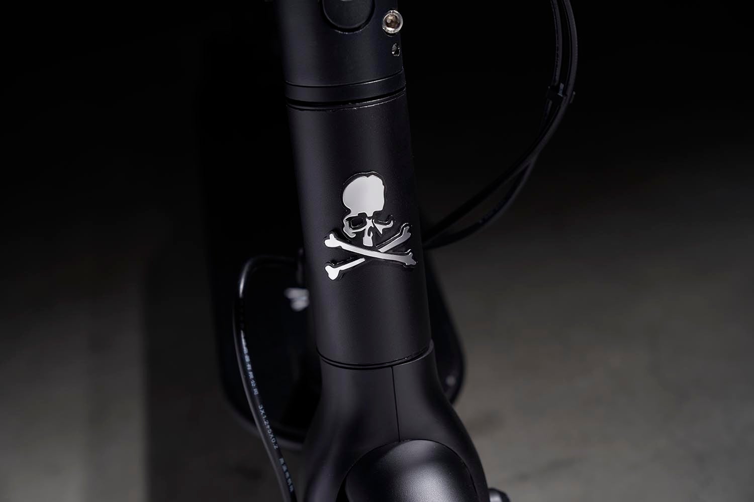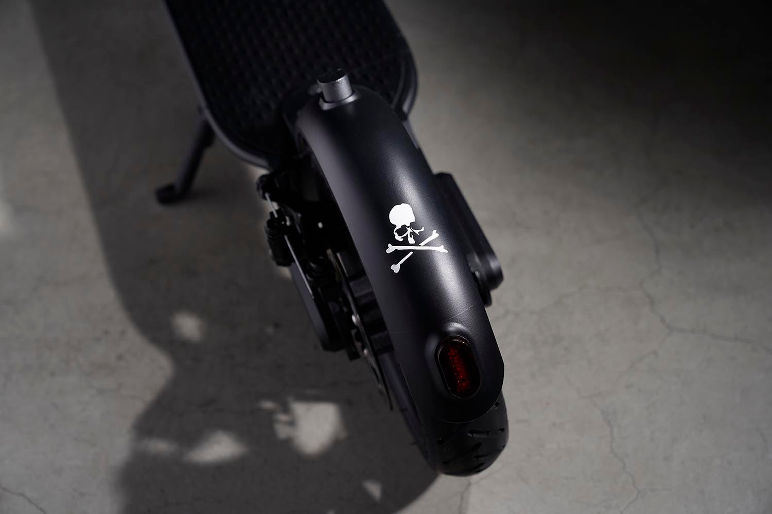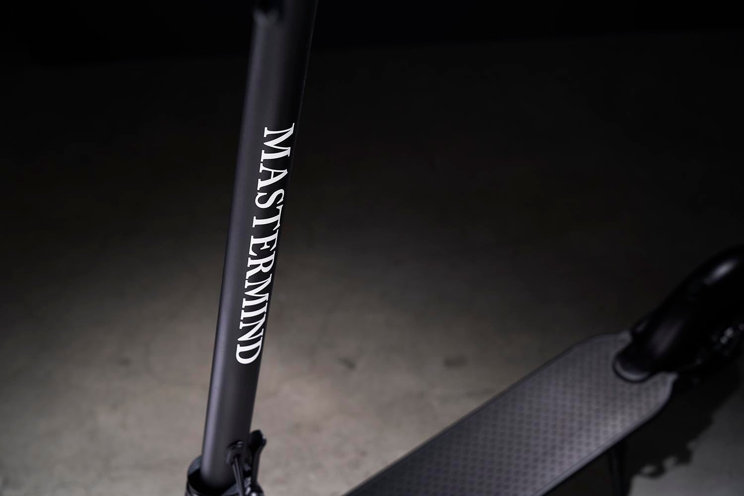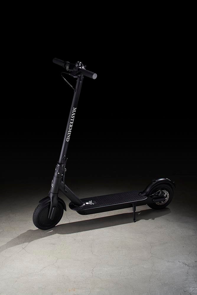 本コラボレーションでは、<マスターマインド・ジャパン>のアイコン“スカル”をエンブレムに配し、“MASTERMIND”ロゴをメインにレタリングした、オールブラックカラーが登場します。モノ作りに並々ならぬ拘りをもつ両ブランドが一掛けた、ここでしか出会えない電動キックボードにご注⽬ください。