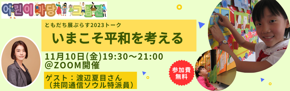 共同通信ソウル支局の渡辺夏目記者をゲストに、尹錫悦政権交代後の韓国から見る南北・日米韓関係などをお話しいただき、世界的にも大きな対立の軸が作られようとしている今、あらためて東アジアから発信できる平和を考えてみたいと思います。また、このような状況の中にあっても各地域から寄せられた子どもたちの絵をご紹介しつつ、ともだち展の最新情報もお伝えしたいと思います。