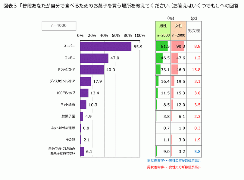 「好き」と回答した人の割合は多くの項目で男性よりも女性のほうが高くなっていますが、「生菓子・半生菓子」(男性:47.0%、女性:61.2%)、「ビスケット・クッキー」(男性:40.9%、女性:56.9%)、「焼菓子(フィナンシェなど)・油菓子(かりんとうなど)」(男性:33.2%、女性:55.6%)などは10ポイント以上の差があります。