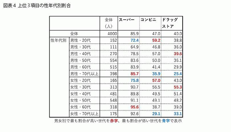 最も割合が高かったのが「スーパー」の85.9%で、2位以下とは大きな開きがあります。2位は「コンビニ」の47.0%、3位は「ドラッグストア」の40.0%です。