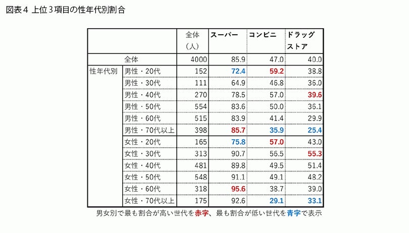 ただ、ポイント差が最も大きかったのが「コンビニ」です。男女ともに20代は6割近いですが、「男性・70代以上」は男性のなかで唯一4割を下回っています。「女性・70代以上」はさらに割合が低く、29.1%と3割を切りました。