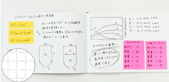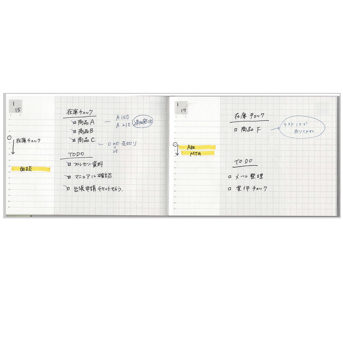 予定管理・メモとしても使える万能フォーマット。左側は、6:00~21:00までのバーチカル、右側は方眼メモスペースとなっています。日付フリーのため、1日1ページという縛りがなく手軽に使えます。
