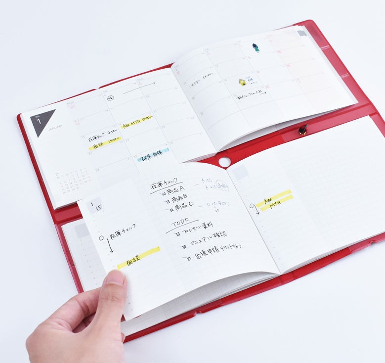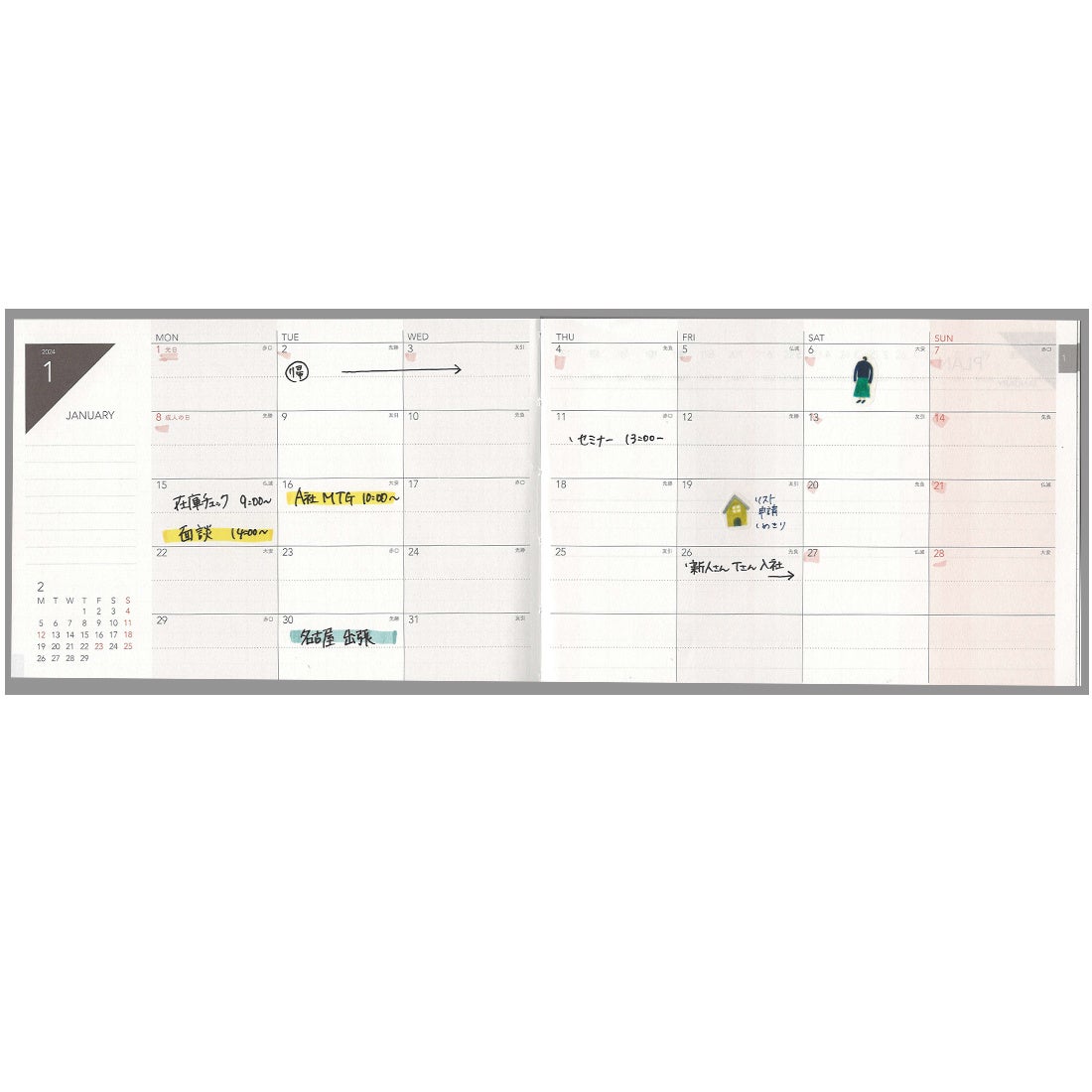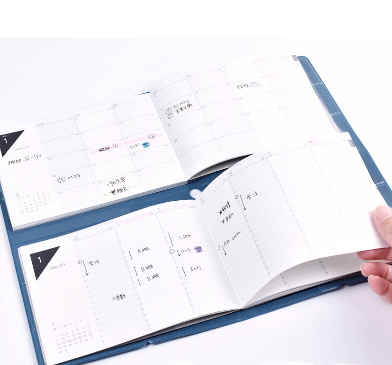 特長)手帳カバー上段に月間カレンダー、下段に日付フリーのデイリー手帳がセットされています。