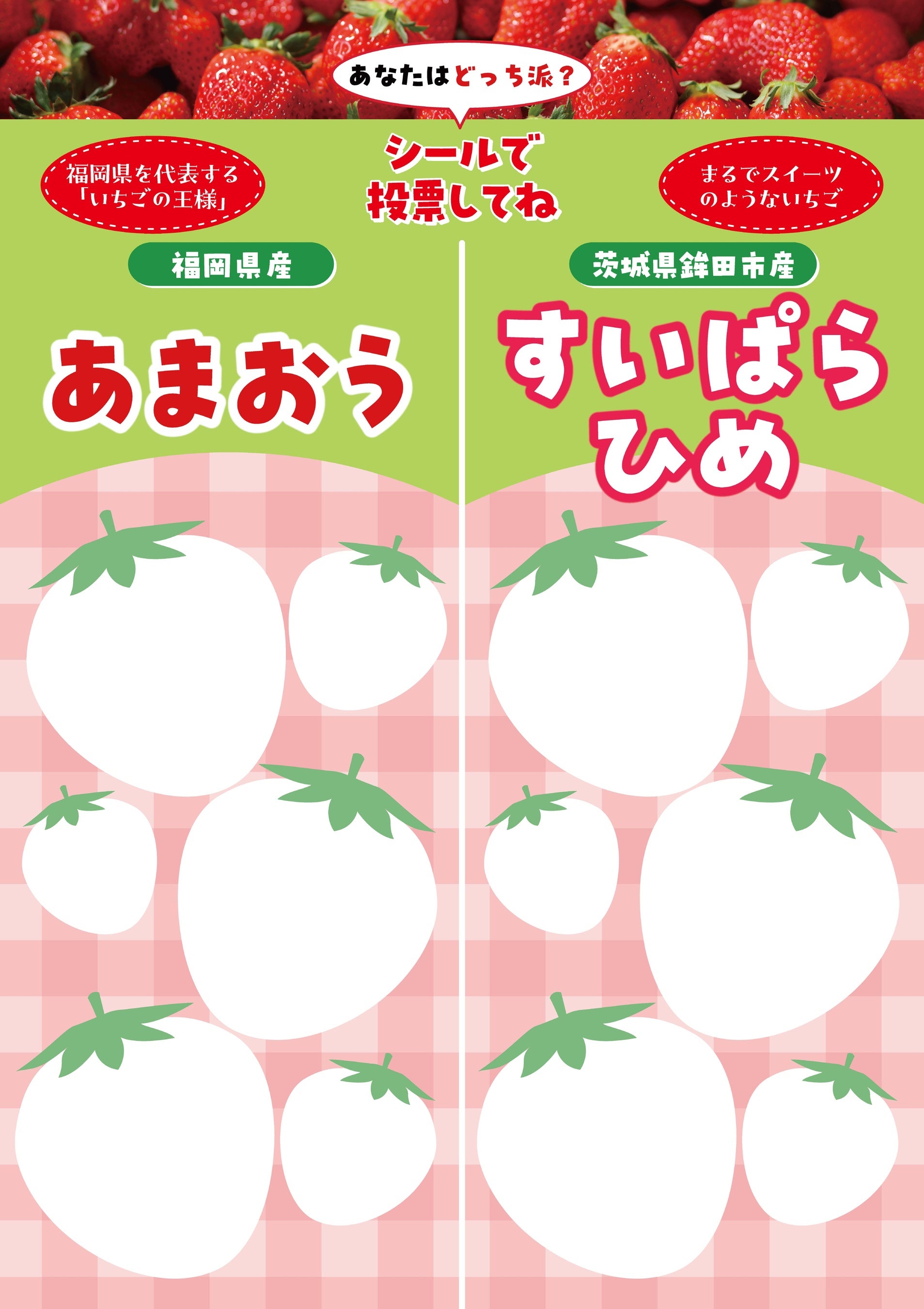 いちごの食べ比べをより楽しんでいただくため、参加型イベント「あなたはどっち派? あまおうvsすいぱらひめ」を全店で同時開催いたします。