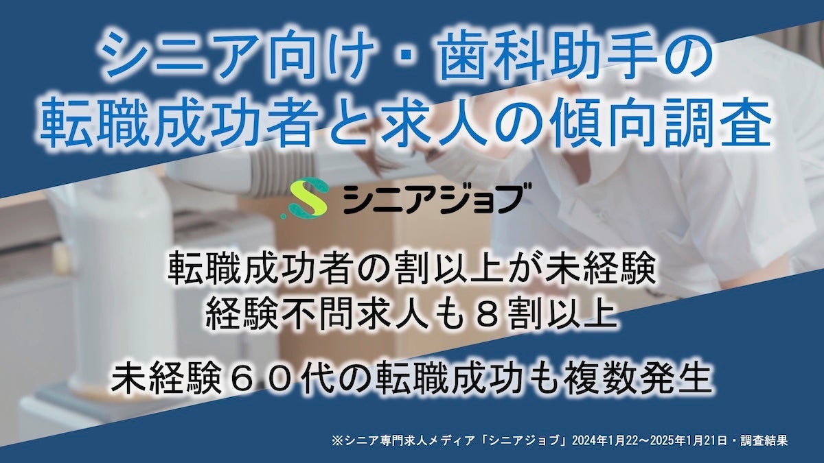 シニア転職支援の(株)シニアジョブ(本社:東京都新宿区/代表取締役 中島康恵/以下、シニアジョブ)は、サービス提供するシニア専門求人メディア「シニアジョブ」における歯科助手の求人と就業決定者を調査し、就業決定者の8割以上が未経験であり、経験不問求人も8割以上であったことを発表しました。実務経験が重視されやすいシニア転職において、職種未経験の60代による複数の就業実績が見られる珍しい例となりました。