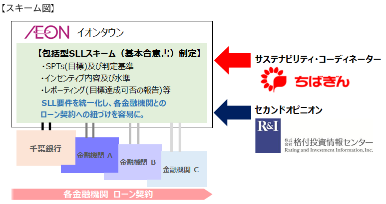 千葉銀行(頭取 米本 努)は、2023年3月31日(金)、イオンタウン株式会社(代表取締役社長 加藤 久誠、以下「イオンタウン」)の包括型サステナビリティ・リンク・ローン・スキーム(以下「包括型SLLスキーム」)制定にあたり、サステナビリティ・コーディネーター※1として策定支援を行うとともに、本包括型SLLスキームに基づくサステナビリティ・リンク・ローン(以下「SLL」)を取り組みましたのでお知らせします。