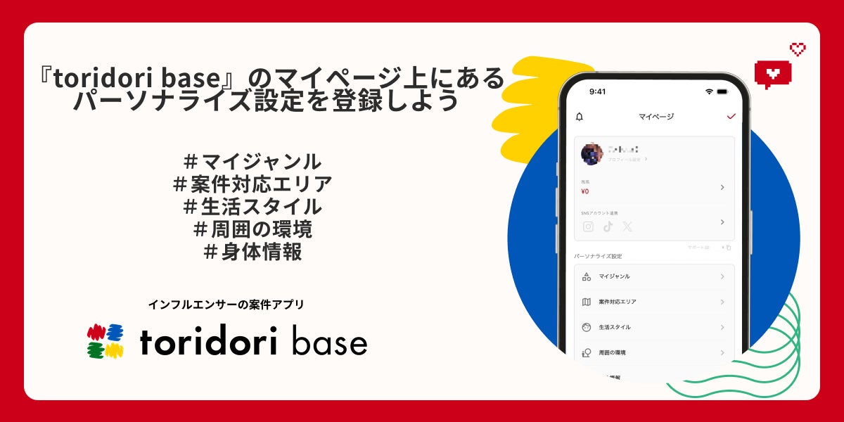 また、『toridori base』のマイページ内にあるパーソナライズ設定の全5項目(①マイジャンル②案件対応エリア③生活スタイル④周囲の環境⑤身体情報)をご登録した方は、本キャンペーンの当選確率が2倍になります。