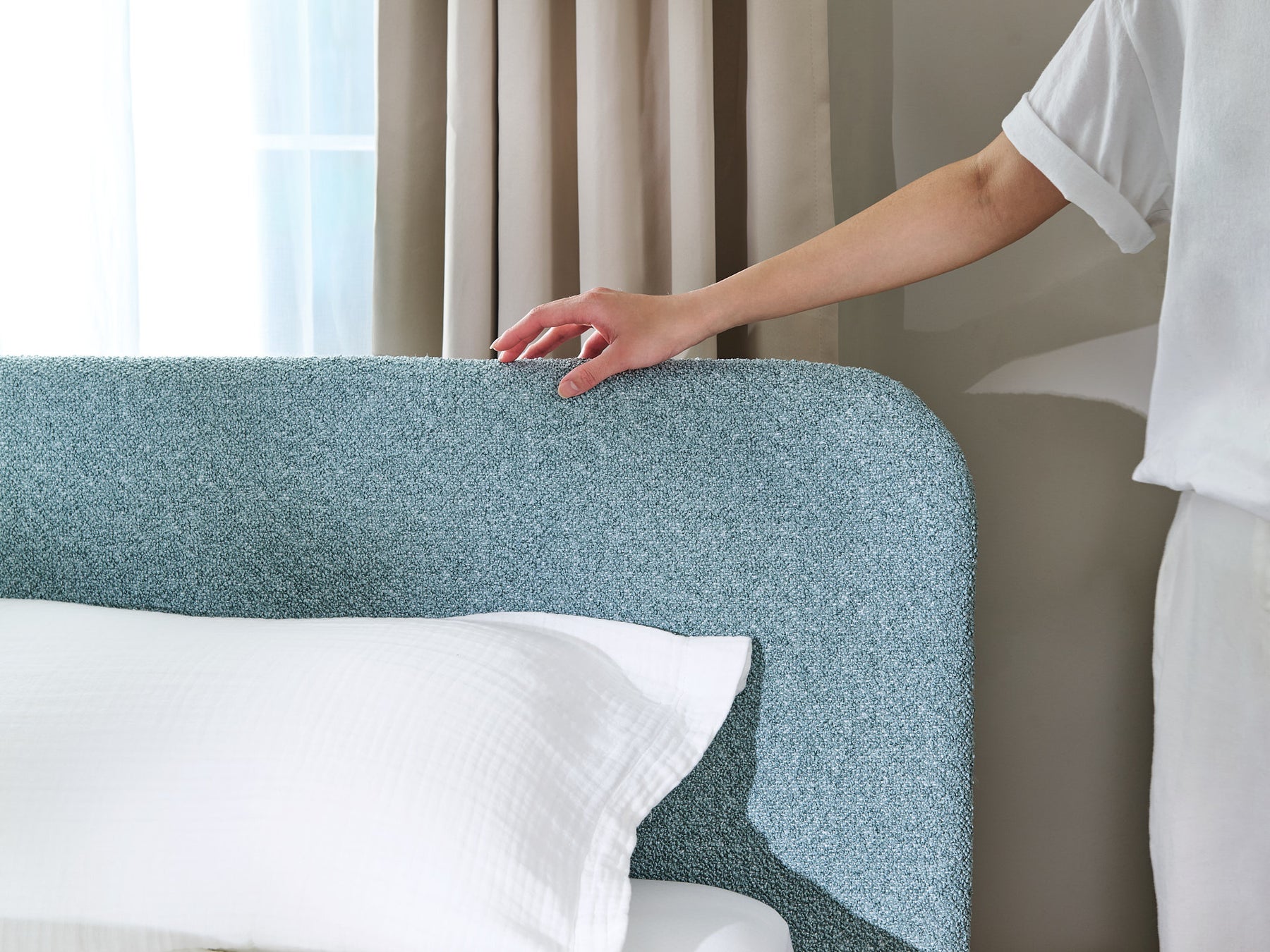 ヘッドボードに寄りかかってスマホをチェックしたり、読書や動画を楽しんだり。寝室をプレミアムな空間に彩る上質なブークレ生地のベッドフレームが、あなたのリラックスタイムをより快適にしてくれます。