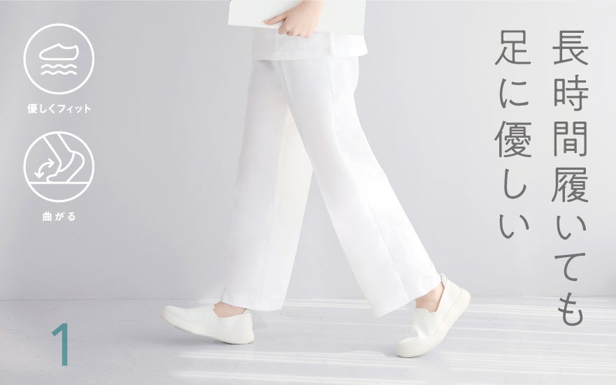 独自開発のソールはラバー材を組み合わせることにより、圧倒的な軽量とグリップ力を両立しました。医療現場の濡れた床でも滑りにくく、耳障りな摩擦音も出にくいのがポイントです。