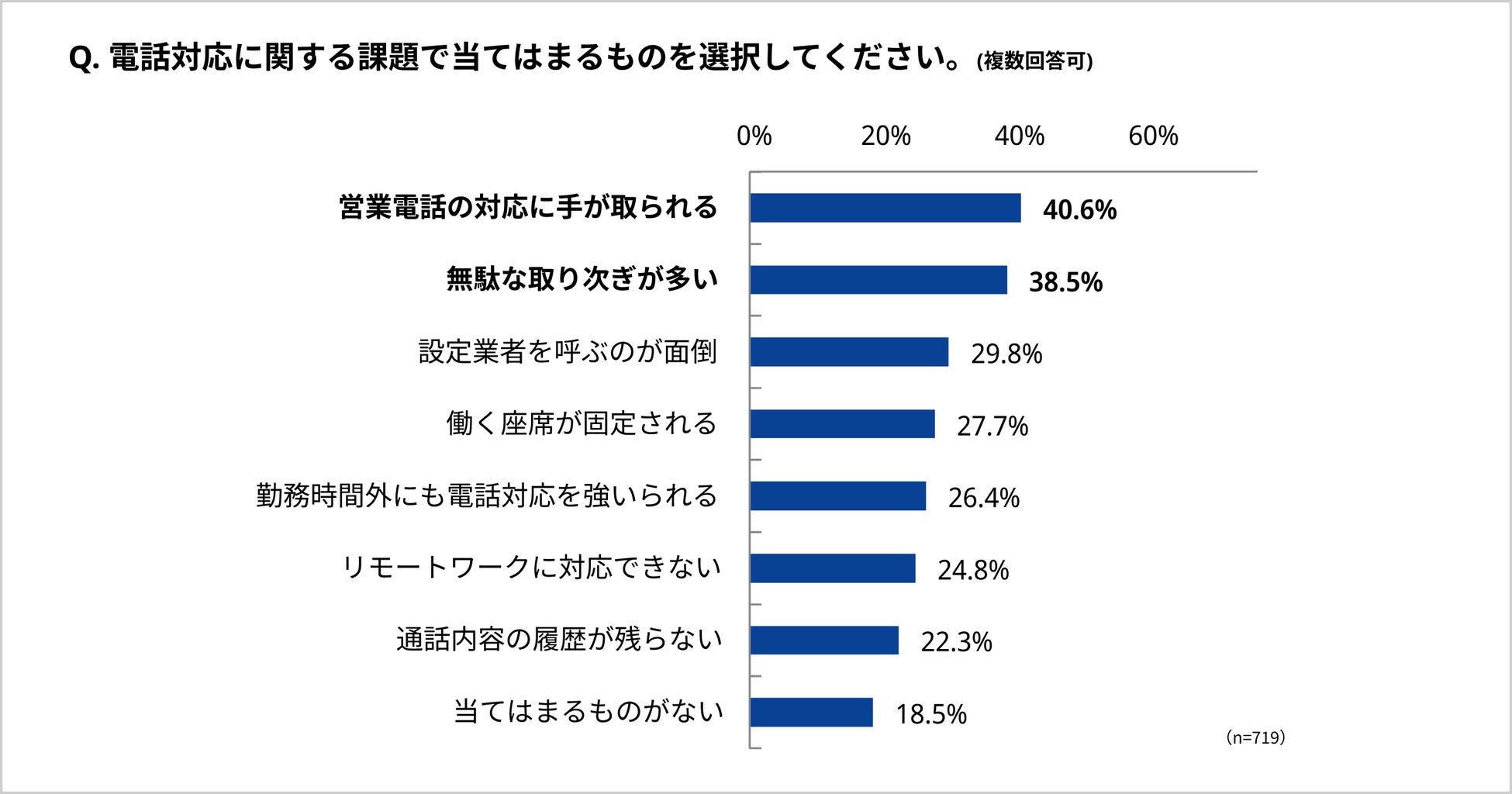 電話対応における課題について最も多かった回答は、「営業電話の対応に手が取られる(40.6%)」、次いで「無駄な取り次ぎが多い(38.5%)」でした。業務に関係のない電話対応にかかる手間に煩わしさを感じている人が多いことがわかります。