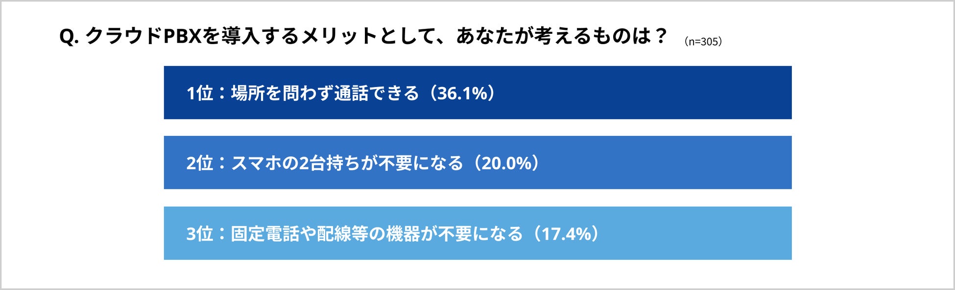 クラウドPBXについて知っていると回答した人に対して、クラウドPBXを導入するメリットを質問したところ、「場所を問わず通話できる(36.1%)」が最も多い回答となりました。次いで、「スマホの2台持ちが不要になる(20.0%)」「固定電話や配線等の機器が不要になる(17.4%)」があげられました。