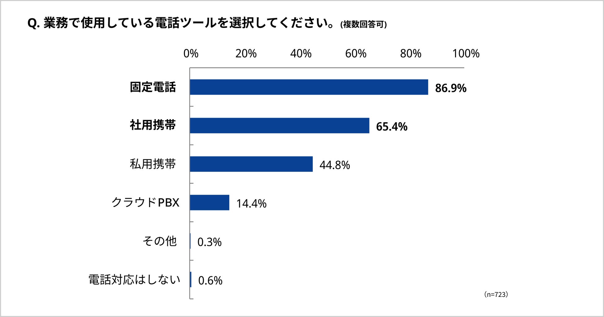 業務で使用する電話ツールの種類は「固定電話(86.9%)」が最多で、次いで「社用携帯(65.4%)」が多い結果となりました。一方で、プライベートで使っている「私用携帯(44.8%)」を業務で使用している人も5割近くいることがわかりました。