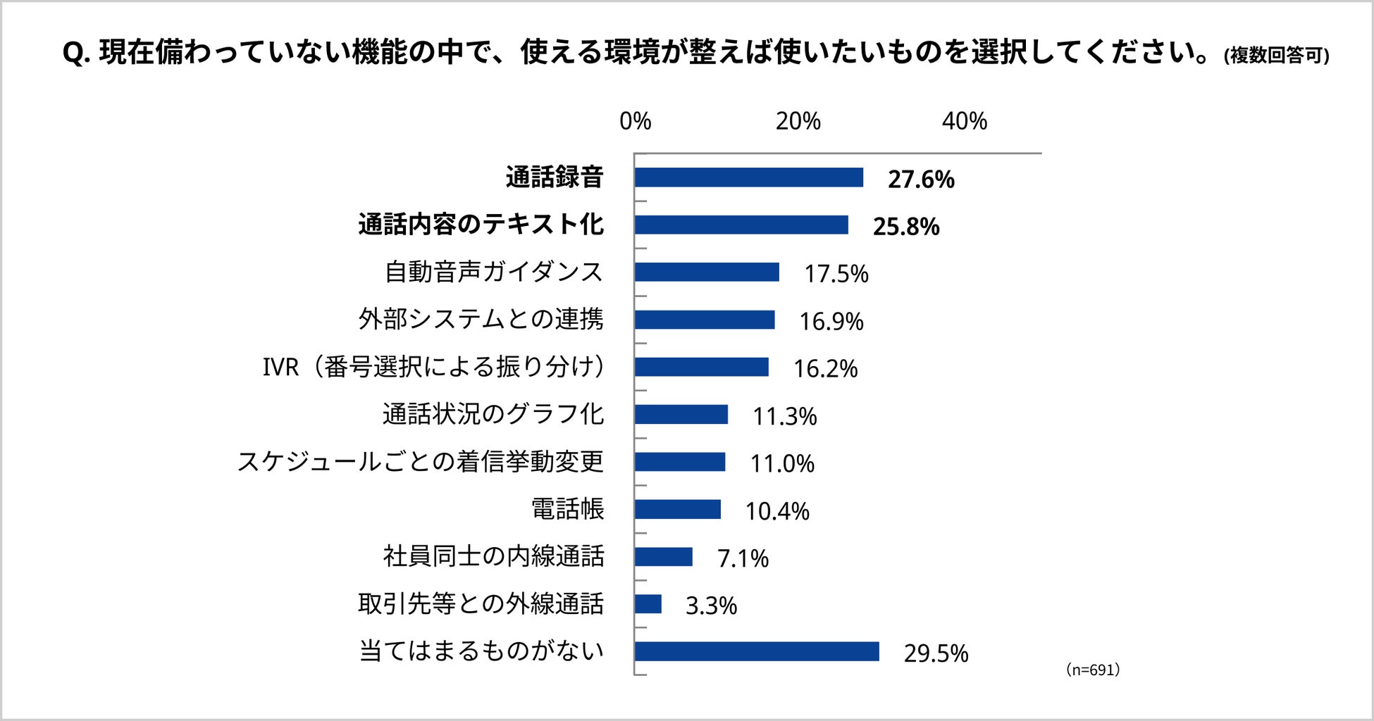 現在備わっていない機能の中で、使える環境が整えば使いたいものは何かという質問で、多かった回答は「通話録音(27.6%)」「通話内容のテキスト化(25.8%)」でした。前述のアンケート結果で、通話内容が思い出せずに困った経験がある人や手動でメモを取っている人が多いことから、通話録音や通話のテキスト化のニーズが高いと考えられます。
